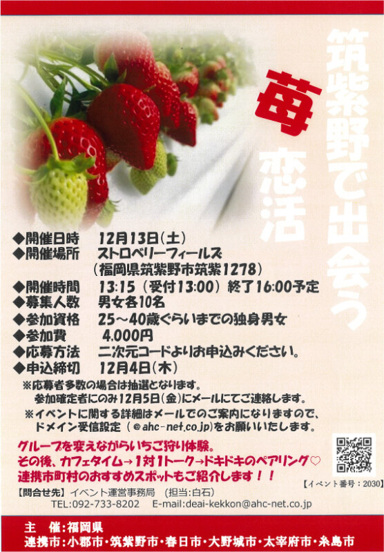 小郡市、筑紫野市、春日市、大野城市、太宰府市、糸島市の市町村連携で行う「苺恋活」。
