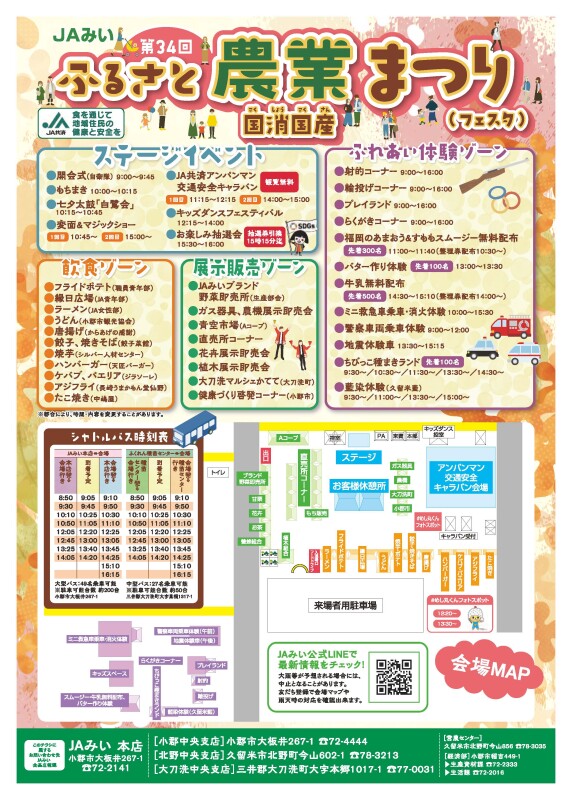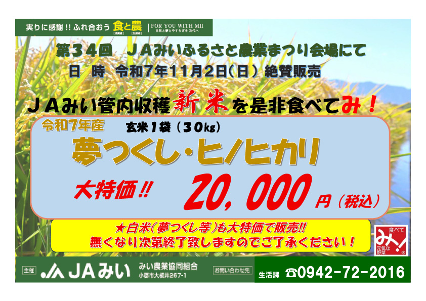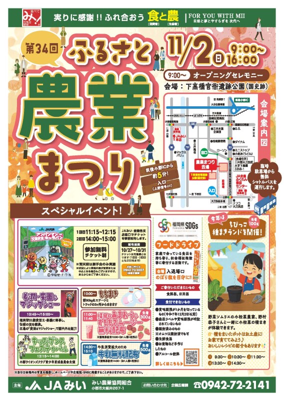JAみい ふるさと農業まつり終了お知らせイベント 公開日:2024.10.22 最終更新日:2025.11.04実りに感謝!!ふれ合おう食と農 JAみい ふるさと農業まつりが開催されます。ステージイベントや展示販売ゾーン、飲食ゾーン、ふれあい体験ゾーンなど盛りだくさんのイベントです。第34回ふるさと農業まつり【日時】9:00~16:00【場所】下高橋官衙遺跡公園(国史跡)【問合せ】JAみい本店(企画広報課) ☎0942-72-2141小郡中央支店 ☎0942-72-4444北野中央支店 ☎0942-78-3213大刀洗中央支店 ☎0942-77-0031