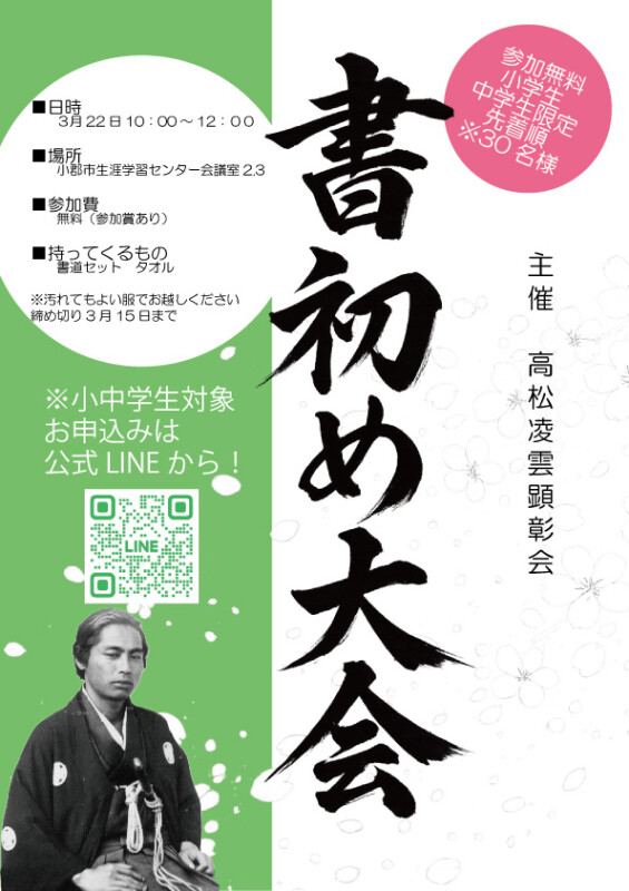 書初め大会(小中学生対象)開催お知らせイベント 公開日:2026.03.03 小中学生を対象に書初め大会を開催。限定30名様(先着)です。【日時】2026年3月22日(日)10時~12時【場所】生涯学習センター会議室2.3【参加費】無料(参加賞あり)【持ってくるもの】書道セット、タオル汚れても良い服でお越しください。【申込方法】チラシのQRコードから【締切】3月15日(日)まで