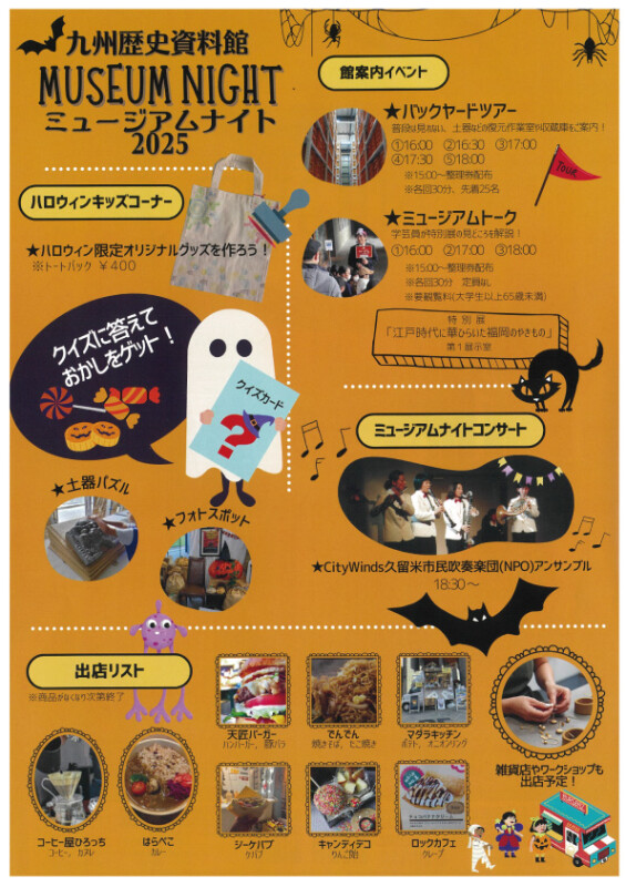 九州歴史資料館特別夜間営業。ミュージアムトーク、バックヤードツアー、土器パズルなど子供向け体験コーナーのほか、キッチンカーや物販などの出店もあります。