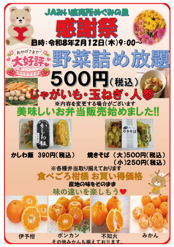 めぐみの里感謝祭開催お知らせイベント 公開日:2024.01.29 最終更新日:2026.02.05JAみい「めぐみの里」では、毎月、日頃のご愛顧に感謝を込めた「めぐみの里 感謝祭」を開催。毎月恒例の野菜の詰め放題をはじめ、今が旬の柑橘類をお買得価格で提供させていただきます。その他、お弁当の販売や「北九とり善」の試食販売会などもあります。ご家族やご友人とお誘い合わせのうえ、ぜひお越しください。【日時】2026年2月12日(木)9時~【開催場所】JAみい めぐみの里(小郡市上岩田1076-1)